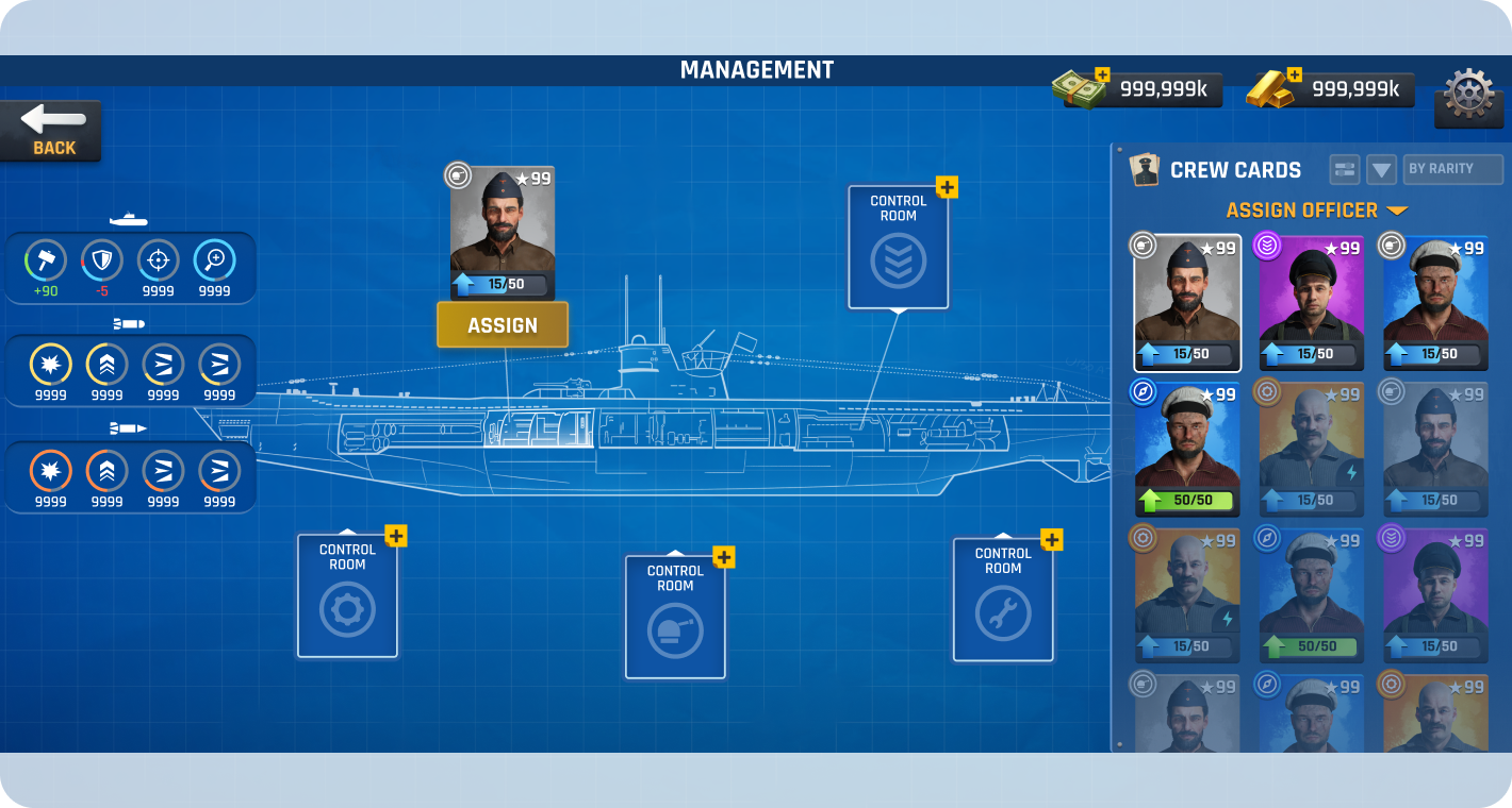 Customize your Uboat crew to gain an edge in combat with upgrades to durability, speed and firepower.